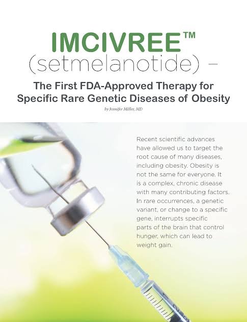 Seperti yang dilaporkan sebelumnya, pada November 2020, FDA AS menyetujui setmelanotide untuk manajemen berat badan pada orang dewasa dan anak-anak semuda 6 tahun dengan obesitas karena proopiomelanocortin (POMC), proprotein convertase subtilisin/kexin tipe 1 (PCSK1), atau reseptor leptin (LEPR ) defisiensi yang dikonfirmasi oleh pengujian genetik — yang juga memiliki gangguan sinyal rasa lapar dari otak.