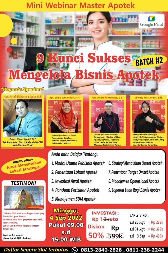Kabar baik bagi sejawat yang akan memulai bisnis apotek dan juga memperbaiki kinerja apoteknya, akan ada sharing ilmu dan pengalaman di event webinar Masterapotek yang membahas tuntas tentang business skill tersebut, temanya 9 Kunci Sukses Mengelola Bisnis Apotek batch#2 pada hari Minggu, 4 September 2022, menghadirkan Keynote Speaker apt. Arief Sidharta Buana, S.Si, Owner Grup Apotek SAE, Tokoh Apoteker Praktek Mandiri (APM) sekaligus Wakil Sekjen PP IAI periode 2022 – 2026. info selengkapnya dapat menghubungi https://wa.me/628112382244 (advertorial)