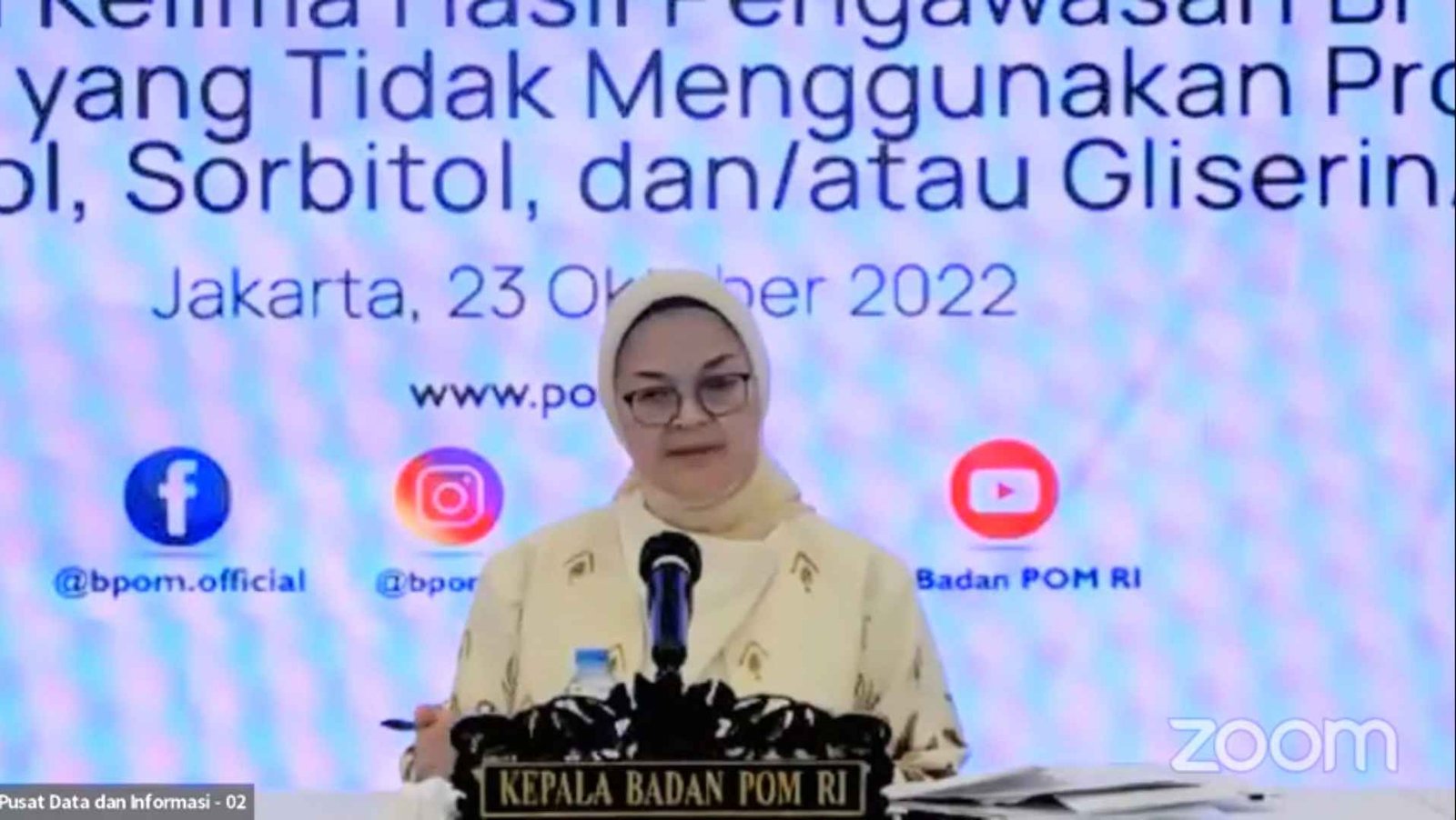 “Dari 102 produk tersebut, 23 produk tidak menggunakan pelarut propilen glikol, gliserin, sorbitol, dan polietilen glikol yang artinya aman tidak tercemar etilen glikol” jelas Kepala BPOM, Penny Lukito.
