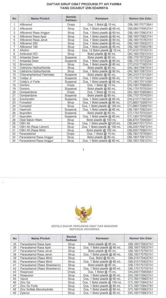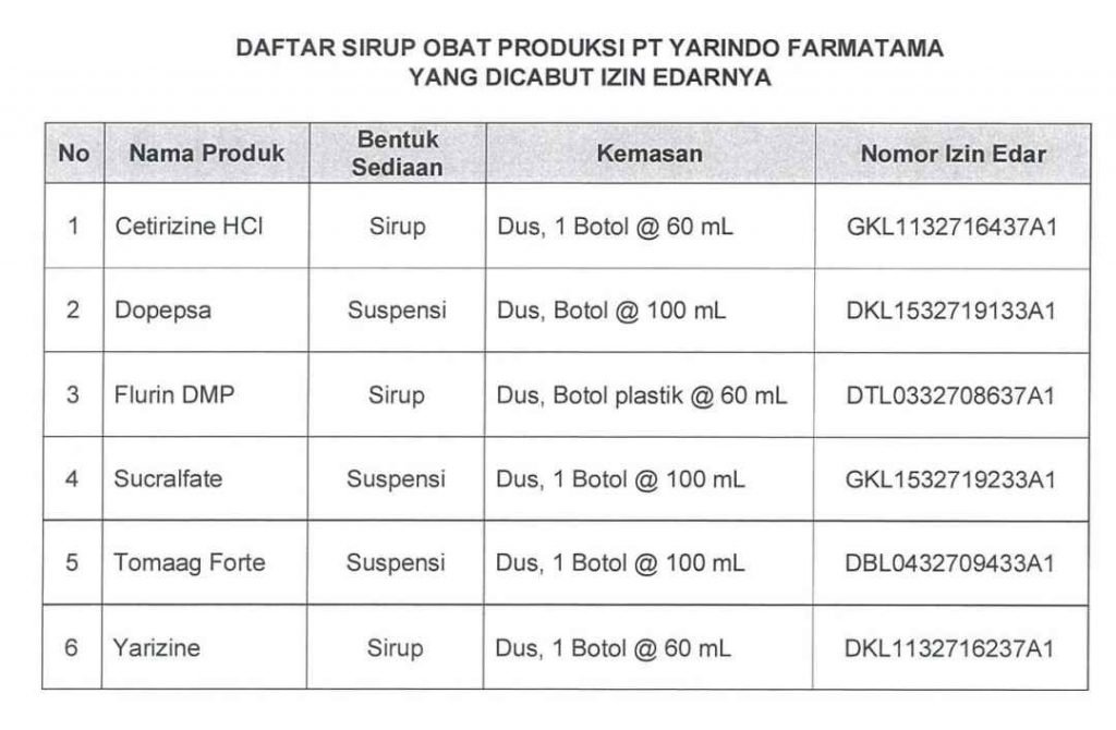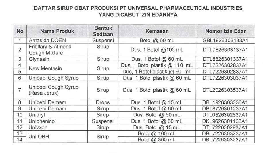 Hal ini berimbas pada penghentian produksi untuk sediaan cairan oral nonbetalaktam dan izin edar sirup obat yang diproduksi ketiga industri farmasi tersebut. Total sebanyak 69 produk yang terdiri dari 6 produk dari PT. Yarindo Farmatama, 14 produk dari PT. Universal Pharmaceutical Industries, 49 produk dari PT. Afi Farma.
