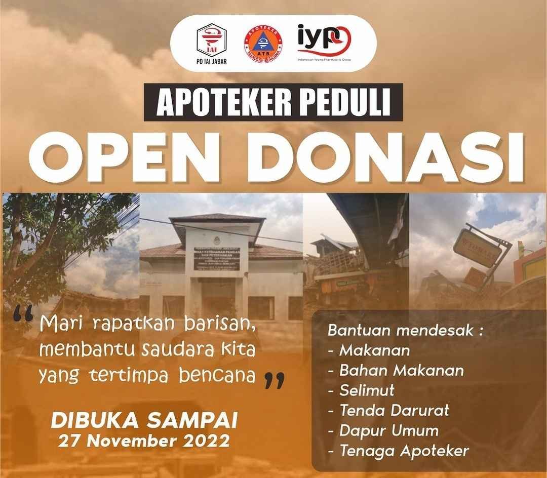 Apoteker peduli bencana gempa Cianjur membuka donasi dalam bentuk bantuan mendesak berupa makanan, bahan makanan, selimut, tenda darurat, dapur umum, dan tenaga apoteker. Selain itu, membuka donasi berupa uang dengan transfer melalui :
