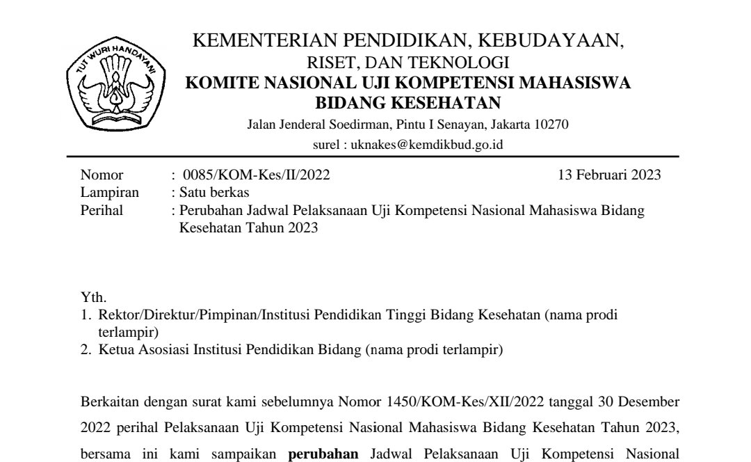 Dalam lampiran surat edaran ini di informasikan terkait jadwal Pelaksanaan Uji Kompetensi Nasional Mahasiswa Bidang Kesehatan Tahun 2023. Ditawarkan ada 3 periode, setiap periode terdiri dari 2 gelombang.