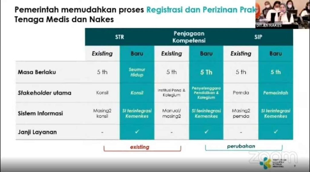 Perubahan stakeholder utama terjadi pada Surat Izin Praktek (SIP), awalnya adalah Pemerintah Daerah menjadi terpusat oleh Pemerintah, dan semua akan terintegrasi melalu aplikasi Sistem Informasi Kemenkes terkait STR, SKP, dan SIP.