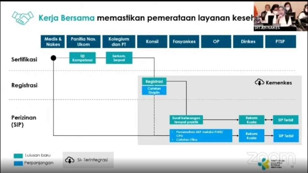 Kerja bersama antara stakeholder memastikan pemerataan layanan kesehatan, misalnya untuk Sertifikasi dilakukan oleh Panitia Nasional Ujian Kompetensi, Serkom dikeluarkan oleh Kolegium dan Perguruan Tinggi, Konsil memiliki peran dalam mengatur STR, dan SIP melibatkan Fasilitas Pelayanan Kesehatan, Organisasi Profesi, Dinas Kesehatan, dan PTSP.