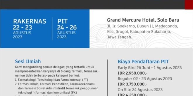 Majalah Farmasetika – Ikatan Apoteker Indonesia (IAI) kembali mengadakan agenda tahunan Pekan Ilmiah Tahunan (PIT) IAI dan Rapat Kerja Nasional (Rakernas) 2023 dengan topik Synergizing Global Innovations: Empowering Pharmacy for Sustainable Global Health Solutions dengan total 25 SKP (Satuan Kredit Partisipasi).