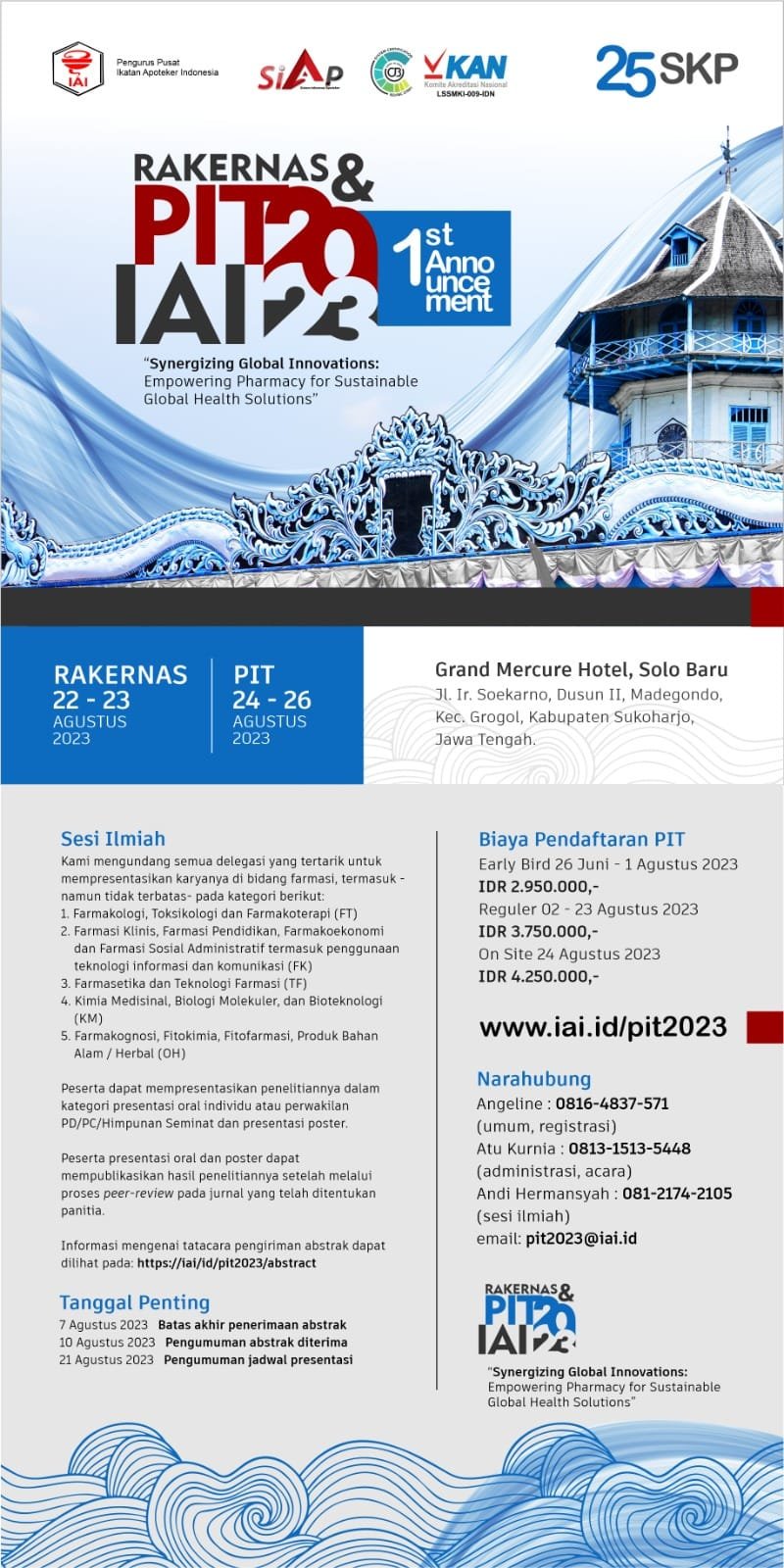 Majalah Farmasetika – Ikatan Apoteker Indonesia (IAI) kembali mengadakan agenda tahunan Pekan Ilmiah Tahunan (PIT) IAI dan Rapat Kerja Nasional (Rakernas) 2023 dengan topik Synergizing Global Innovations: Empowering Pharmacy for Sustainable Global Health Solutions dengan total 25 SKP (Satuan Kredit Partisipasi).