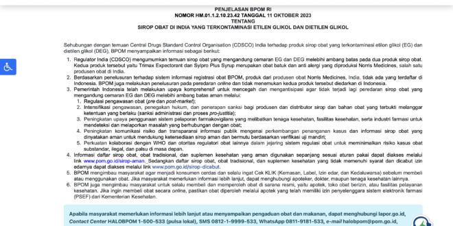 Majalah Farmasetika – Pada tanggal 11 Oktober 2023, Badan Pengawas Obat dan Makanan Republik Indonesia (BPOM RI) telah mengeluarkan edaran resmi dengan nomor HM.01.1.2.10.23.42 mengenai temuan produk sirop obat dari India yang terkontaminasi etilen glikol (EG) dan dietilen glikol (DEG). Informasi ini disampaikan sehubungan dengan temuan Central Drugs Standard Control Organisation (CDSCO) India terhadap dua produk sirup obat yang melebihi ambang batas cemaran EG dan DEG.