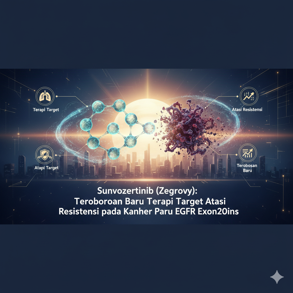 ZEGROVY merupakan suatu penghambat kinase yang diindikasikan untuk pengobatan metastasis NSCLC dengan mutasi EGFR exon20ins yang direkomendasikan untuk digunakan pada dosis 200 mg secara oral (sekali sehari) dengan disertai konsumsi bersama dengan makanan. Sediaan yang tersedia saat ini berupa tablet 150 mg dan 200 mg (FDA, 2025). Kehadiran Sunvozertinib (ZEGROVY) yang telah mendapatkan persetujuan dari FDA AS dan Badan POM RI pada tahun 2023 menjawab tantangan kritis dan menandai era baru pengobatan presisi di Indonesia. Terapi ini menawarkan paradigma baru yang secara signifikan lebih unggul dibandingkan rejimen kemoterapi platinum yang sebelumnya menjadi andalan. Selain itu, terapi ini juga menunjukkan keunggulan dalam mengontrol metastasis sistem saraf pusat, sesuatu yang cukup sulit dicapai dengan pengobatan kemoterapi. Kehadiran Sunvozertinib menegaskan prinsip fundamental personalized oncology dan menekankan pentingnya karakterisasi molekuler tumor yang komprehensif pada setiap pasien NSCLC (Pennell et al., 2019).