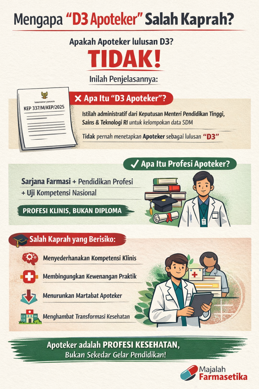 Perlu ditegaskan, KEP 337/M/KEP/2025 bukan regulasi profesi, tidak mengatur kewenangan praktik, dan tidak dimaksudkan untuk mendefinisikan identitas profesi apoteker. Namun, ketika keputusan administratif ini dipahami secara keliru, terjadi reduksi makna profesi yang berimplikasi luas.